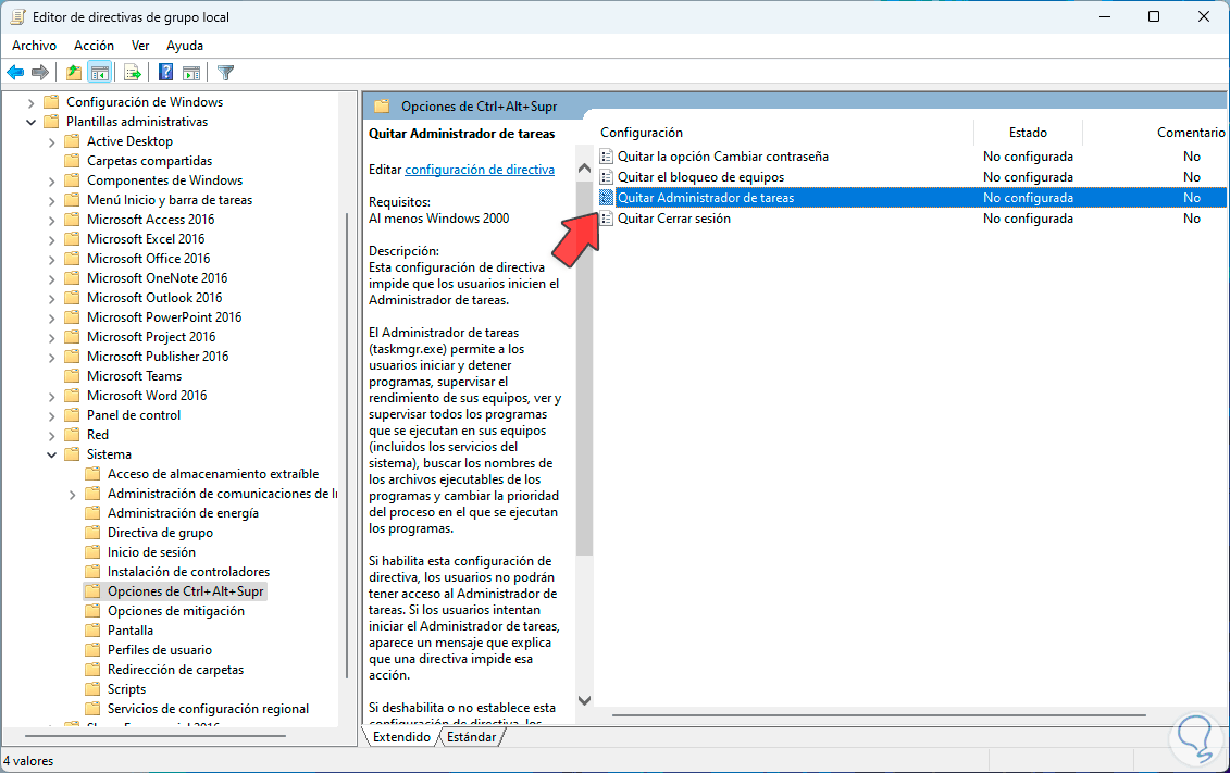 Damos doble clic en la política llamada “Quitar Administrador de tareas”: