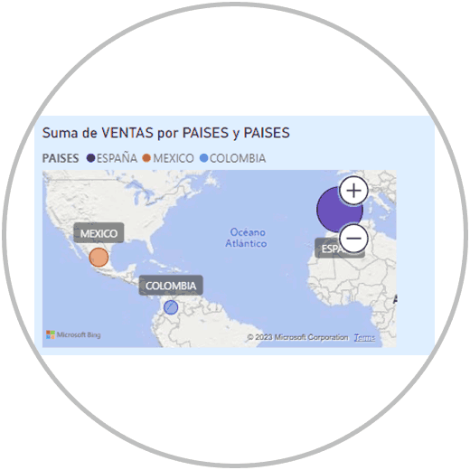 - Por último, queremos añadir un mapa para ver de forma visual, los países donde tenemos ventas, y además ver la importancia de cada país según las ventas que se han conseguido en cada zona geográfica.