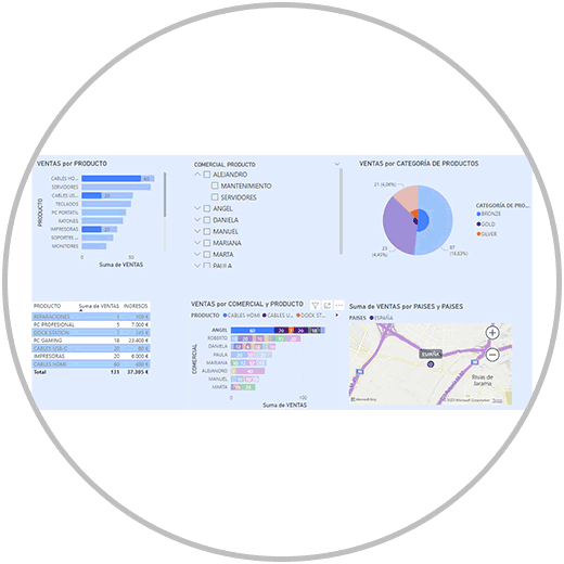 Para realizar un Dashboard, vamos a usar nuestro ejemplo. Tenemos los datos de una empresa que vende productos informáticos, con representación en varios países, donde tenemos la información desglosada por comercial, y también por producto.