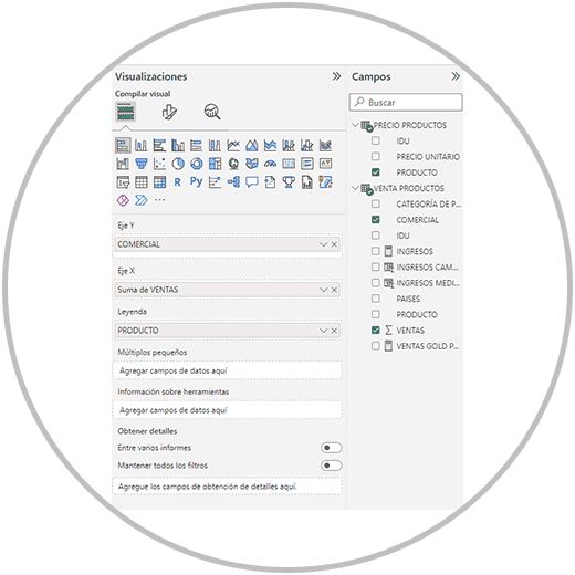 Para hacer este gráfico, tenemos que seleccionar el tipo de gráfico circular, como en la imagen abajo, seleccionar los campos “CATEGORIA DE PRODUCTOS” Y “VENTAS”, y distribuirlos así en valores y detalles: