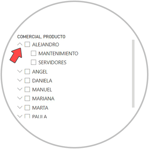 Como podemos ver en la imagen abajo están los nombre de todos los comerciales, y a la izquierda del nombre, veremos una flecha que al hacer clic despliega los productos que ha vendido cada persona.