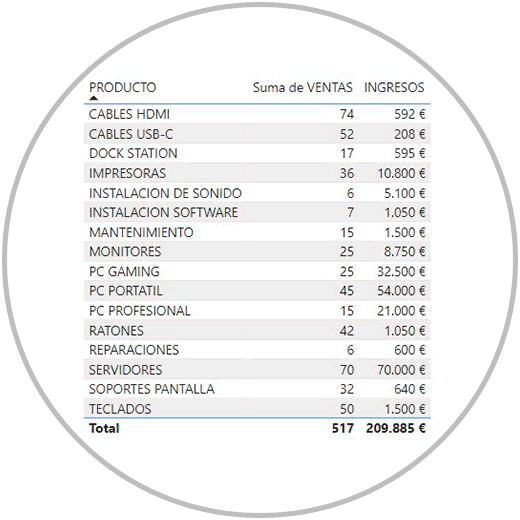 Después de seleccionar los campos, vamos a ver ya la tabla de datos con la información de las ventas de producto, así como los ingresos generados.