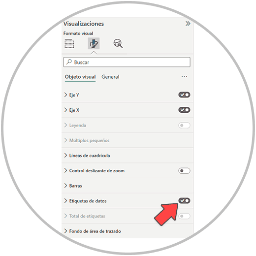 Recuerda que, si quieres añadir en el gráfico la etiqueta de datos, puedes activar la opción dentro del menú “Dar formato a su objeto visual”