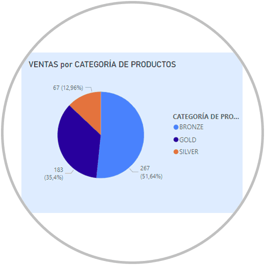 Ahora vamos a crear un gráfico circular comúnmente llamado gráfico de tarta, para poder ver en un gráfico simple cómo se distribuyen todas las ventas, según su categoría de producto. Tenemos 3 categorías de productos (Gold, Bronze y Silver). Queremos ver las ventas de cada categoría, como se representan en un gráfico circular, y qué porcentaje de las ventas se asigna a cada categoría.