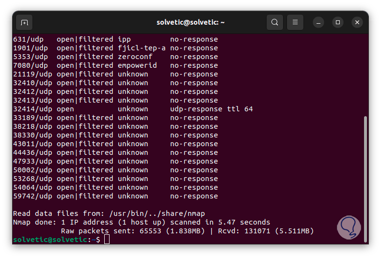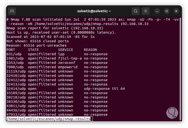 Podemos ver que 65530 puertos fueron cerrados, encontramos la IP de destino, el tiempo usado y más.