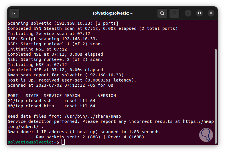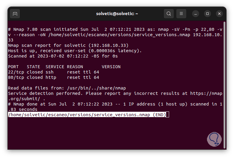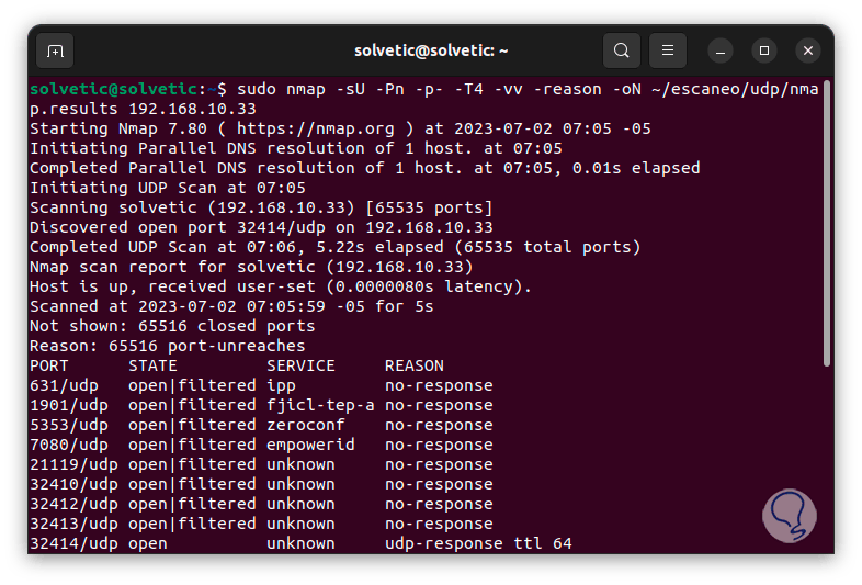 Podemos ver el resultado total del comando. Vemos el puerto, estado, servicio detectado y razón.