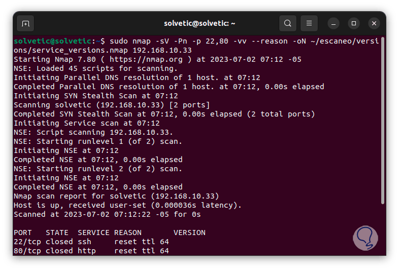 sudo nmap -sV -Pn -p 22,80 -vv --reason -oN ~/nombre/versions/service_versions.nmap IP_equipo
