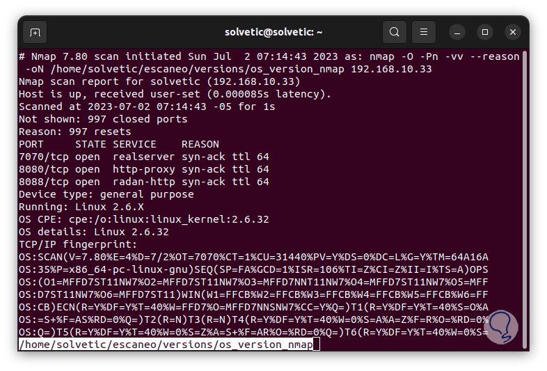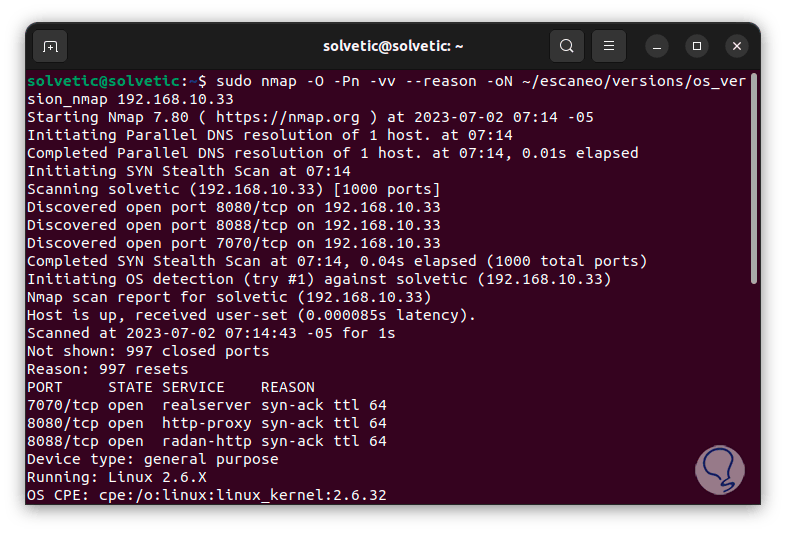 sudo nmap -O -Pn -vv --reason -oN ~/nombre/versions/os_version.nmap IP_equipo