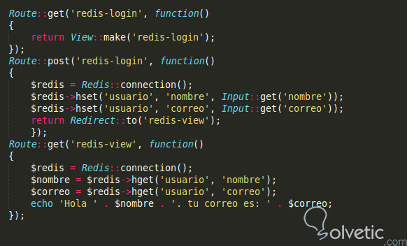 1- En primer lugar debemos crear algunas rutas, la primera será la que nos muestre el formulario cuando hagamos la petición GET, luego crearemos una ruta que capture el envío del formulario vía Post y le pase los valores a Redis, por último debemos crear una ruta que llame a una vista y muestre los valores obtenidos desde Redis. Veamos el código que debemos emplear: