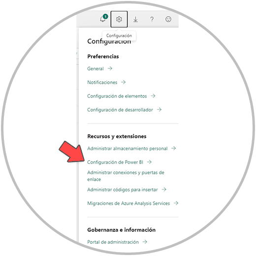 Después de hacer clic en “Configuración”, buscamos en el apartado “Recursos y Extensiones”, la opción “Configuración de Power BI”.