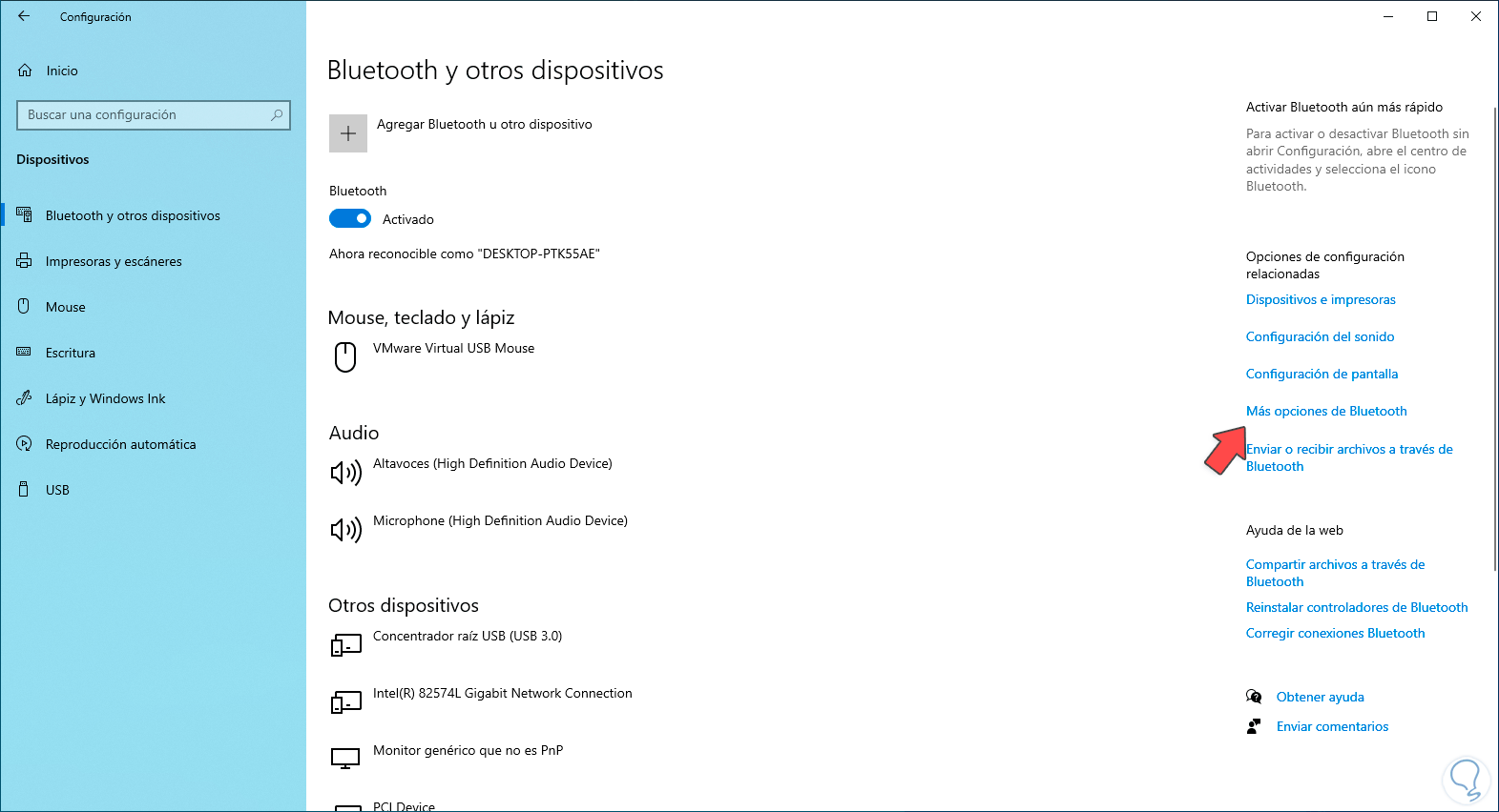 Si por alguna causa no vemos el icono de Bluetooth, vamos a ir de nuevo a “Configuración” y allí damos clic en “Más opciones de Bluetooth”: