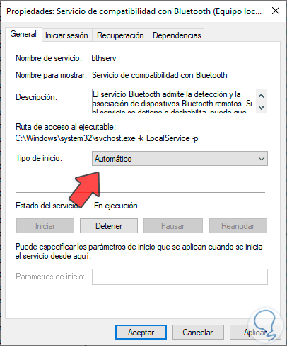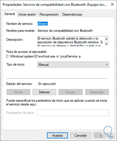 Este servicio se encarga de aceptar la detección y la asociación de dispositivos Bluetooth remotos que estén en el rango disponible, si el servicio no se ha iniciado o esta con error es la causa para que no podamos usar el Bluetooth en Windows 10, damos doble clic sobre el servicio para ver sus propiedades: