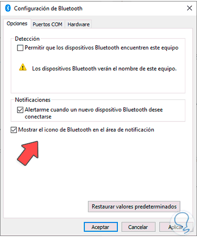 En la ventana emergente vamos a validar que la casilla “Mostrar el icono de Bluetooth en el área de notificación” este activo. Aplica los cambios si es necesario..