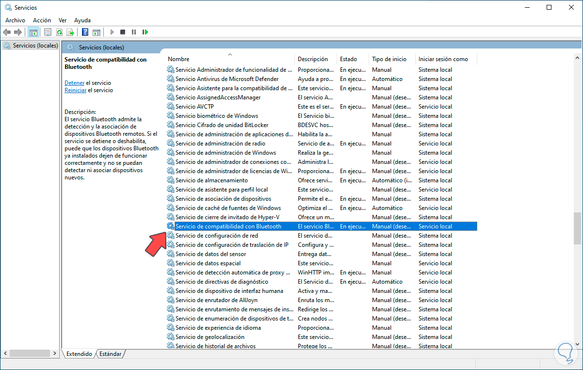 En la ventana de los servicios vamos a seleccionar la línea “Servicio de compatibilidad de Bluetooth”: