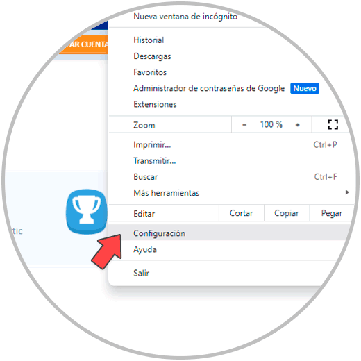 Para el caso de Google Chrome abrimos el navegador, damos clic sobre el menú “Personalizar y controlar Google Chrome” y luego damos clic en “Configuración”: