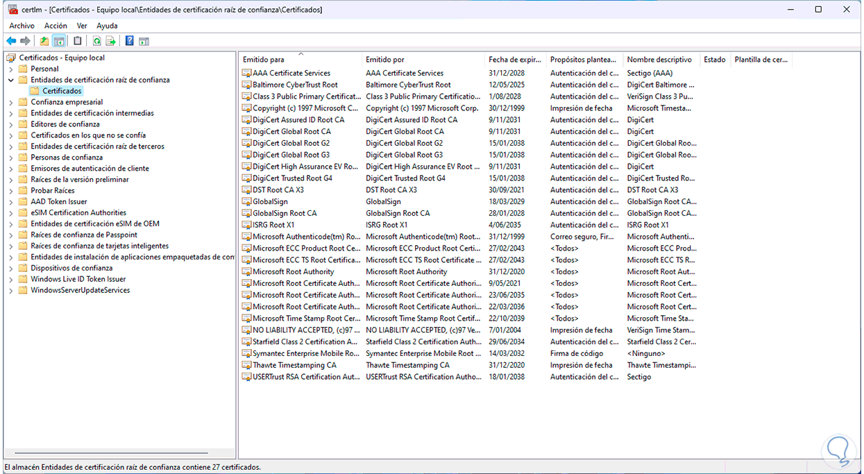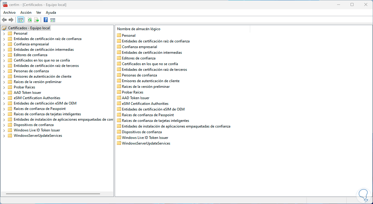 Al acceder a alguna de estas carpetas podremos ver los certificados que la componen: