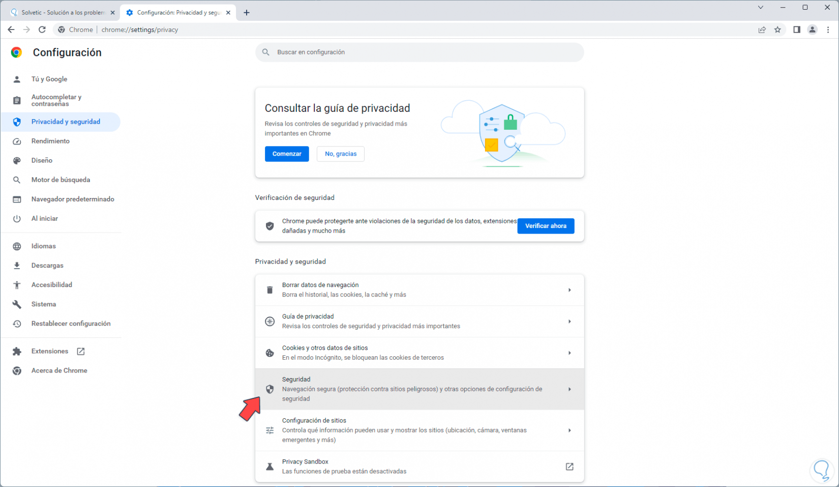 Ahora vamos a ir a la sección “Privacidad y seguridad” y allí damos clic en “Seguridad”: