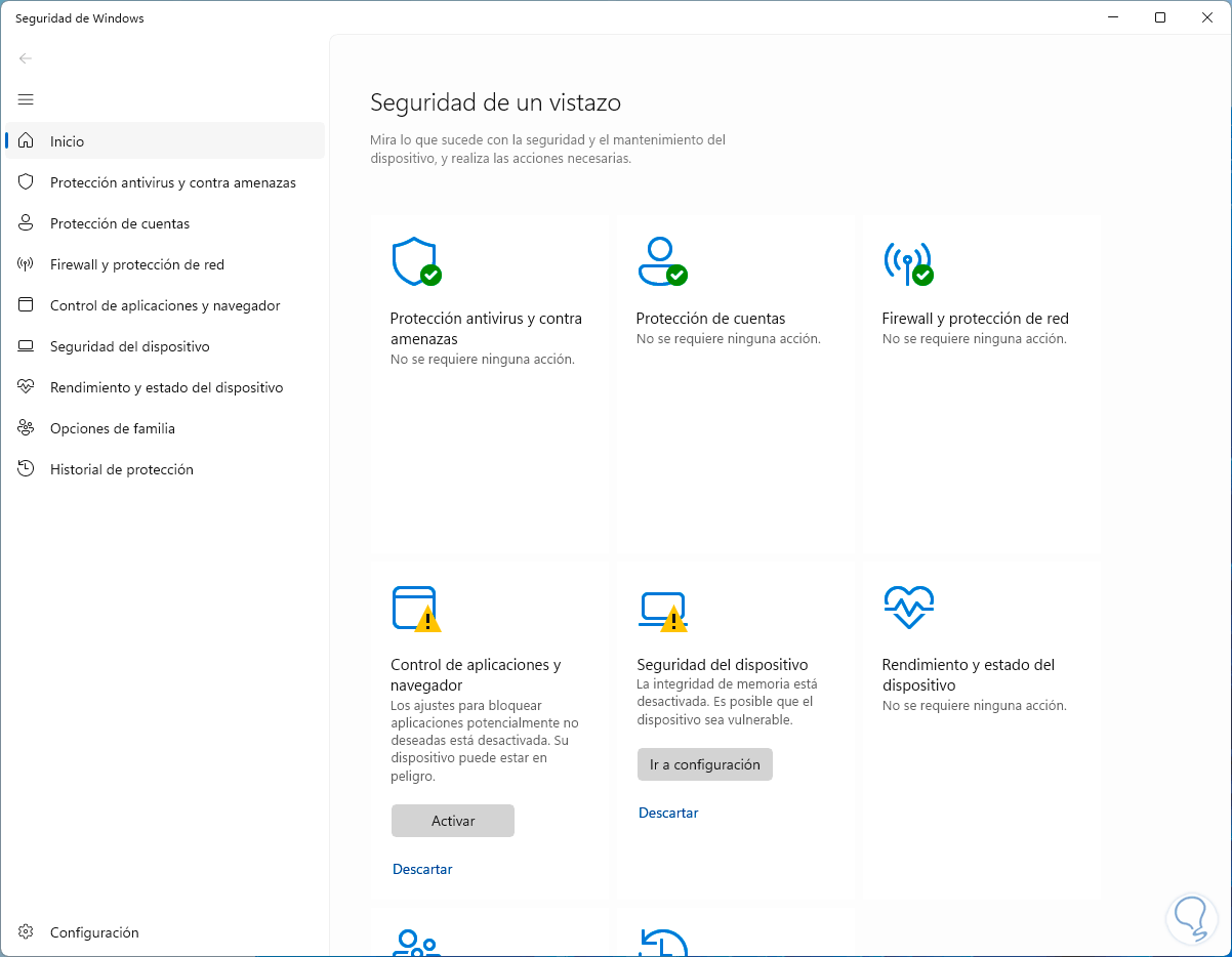 - Seguridad del dispositivo: permite configurar la configuración de seguridad integrada del dispositivo tal como lo es el aislamiento del núcleo y administrar la seguridad del procesador.