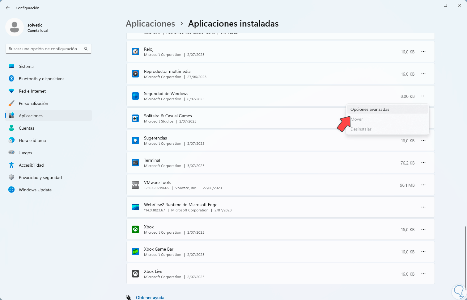 Allí vamos a ubicar “Seguridad de Windows”, damos clic sobre su menú contextual y luego damos clic en “Opciones avanzadas”: