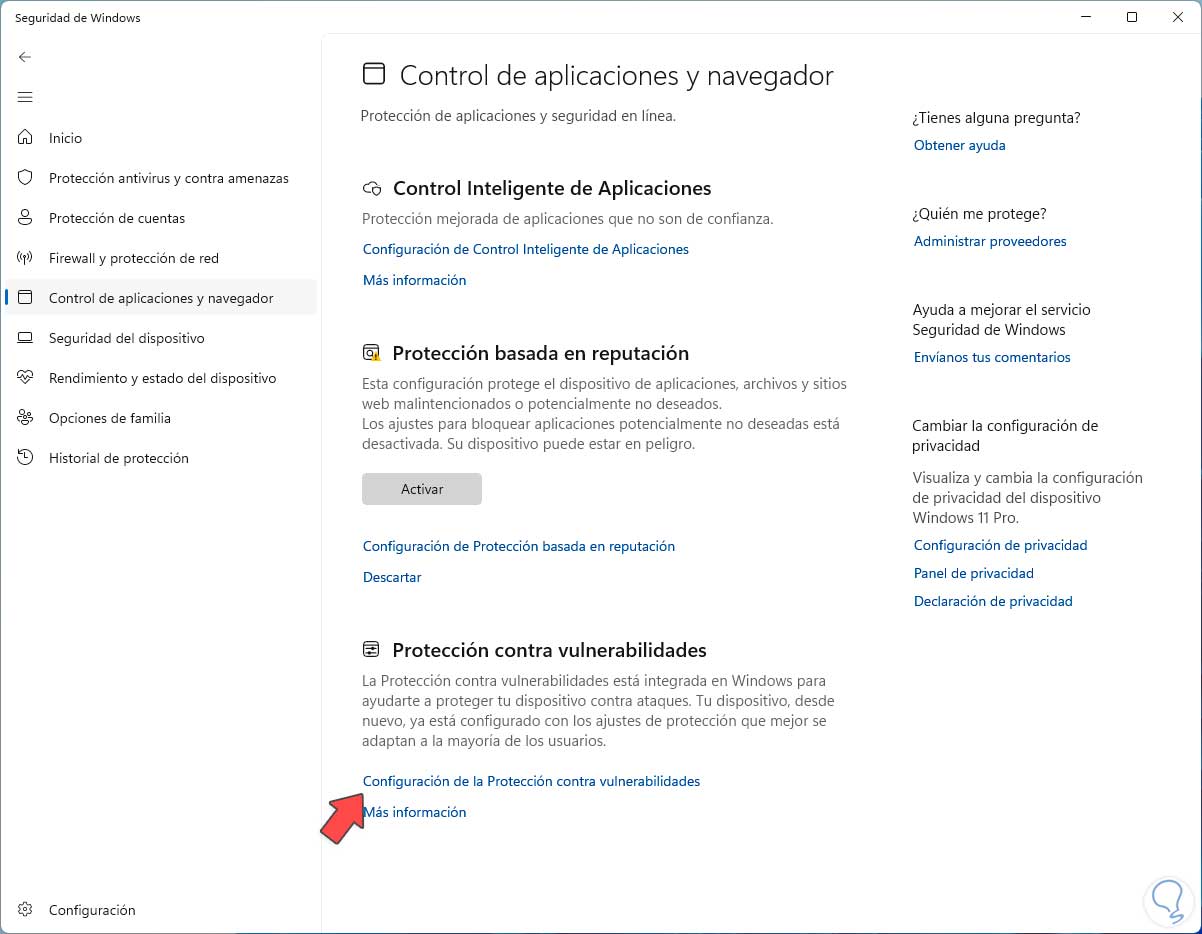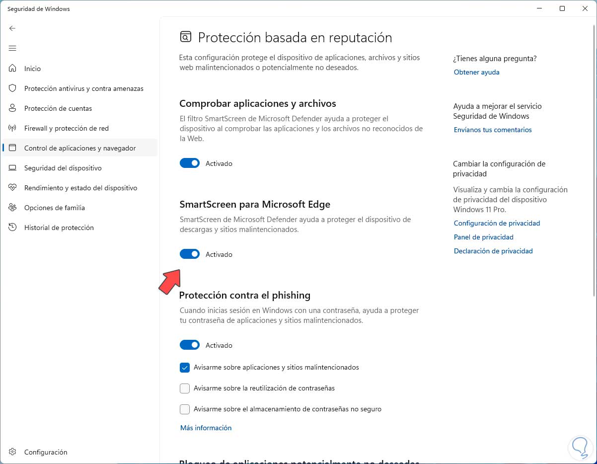 Ahora vamos a la sección “Control de aplicaciones y navegador”: