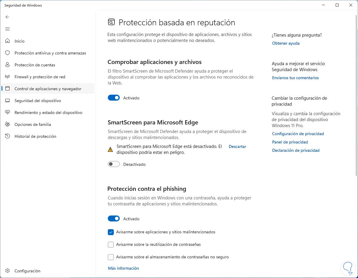 Desactivamos la opción “SmartScreen para Microsoft Edge”.