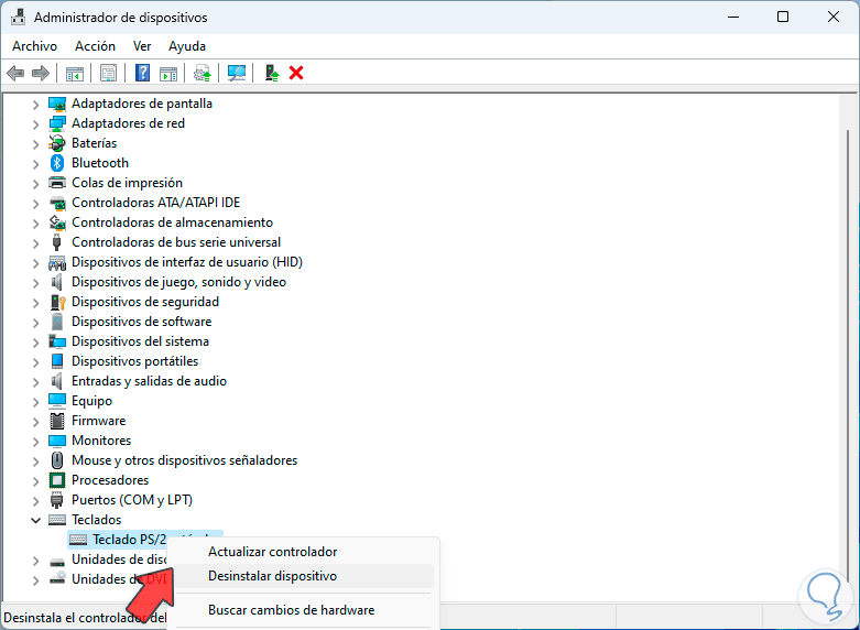 En la ventana del administrador vamos a ir a la sección “Teclados”, allí daremos clic derecho sobre el controlador del teclado y seleccionamos la opción “Desinstalar dispositivo”: