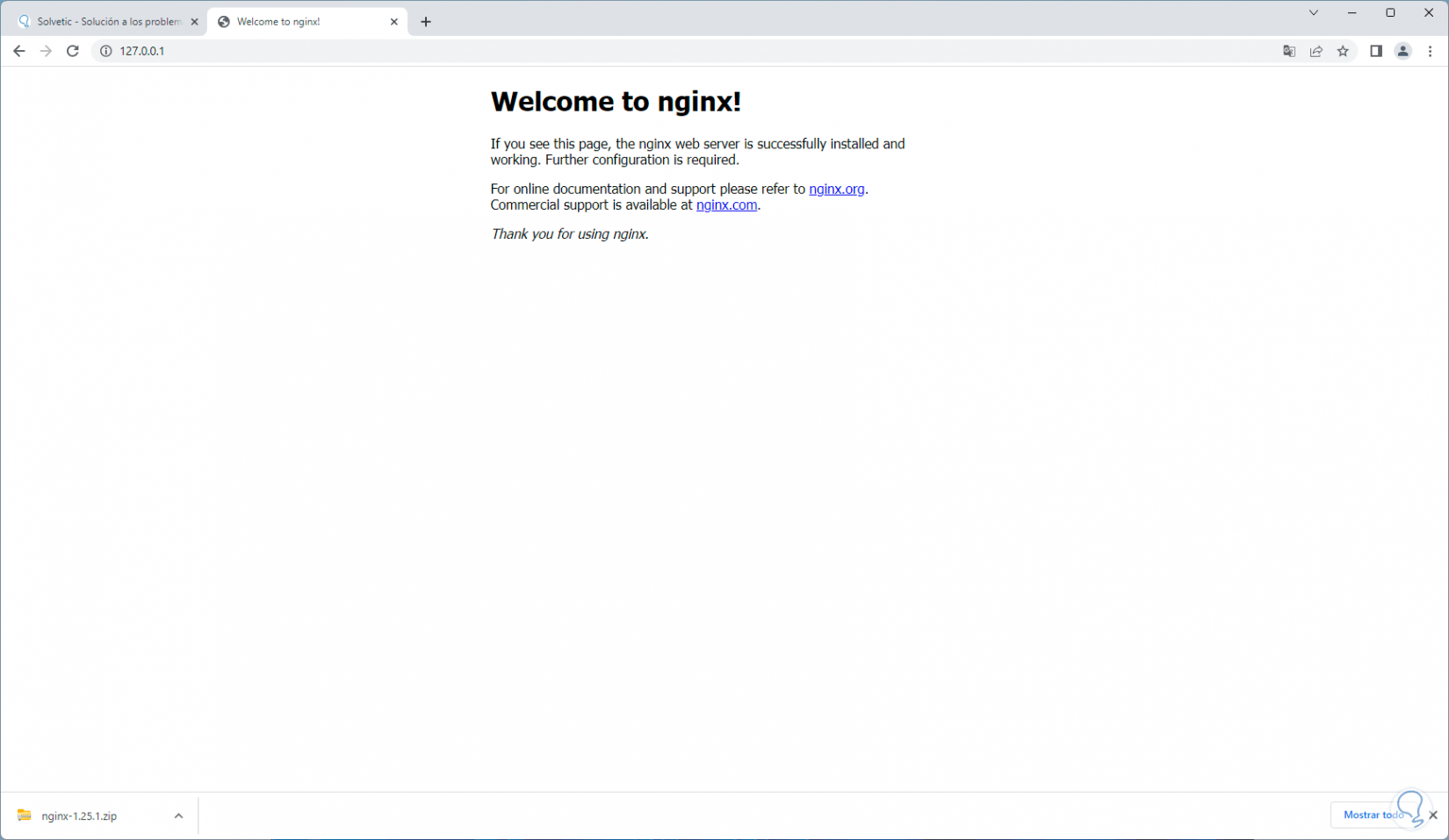 Es momento de validar que se haya instalado, abrimos un navegador e ingresamos la dirección 127.0.0.1 o bien la palabra localhost, al pulsar Enter debemos ver el mensaje de Nginx: