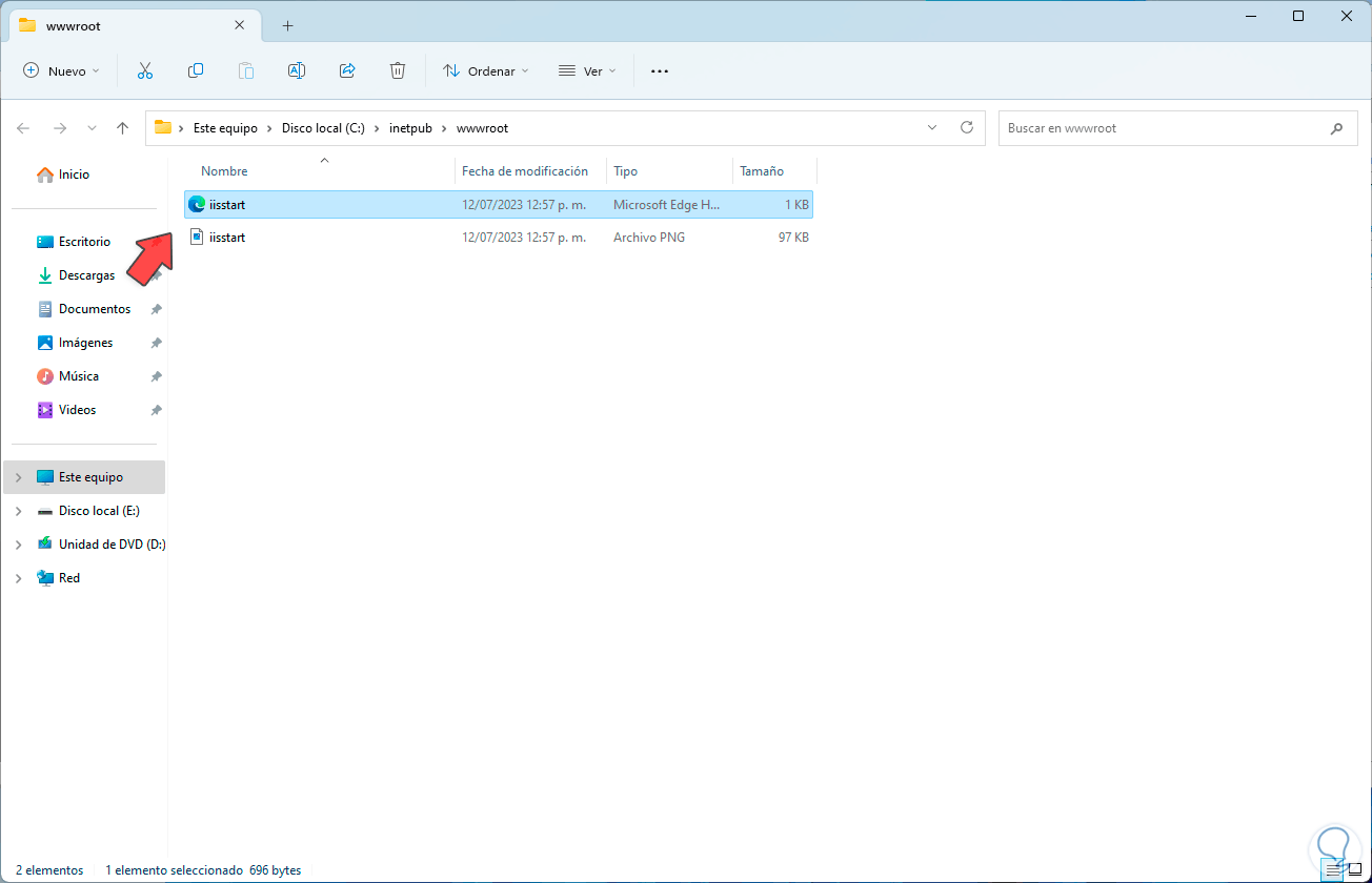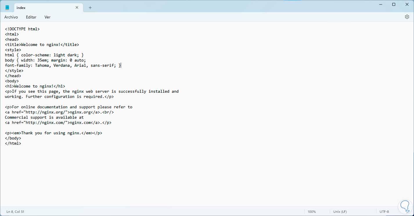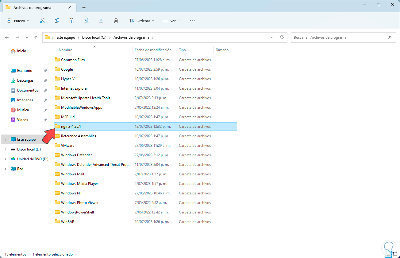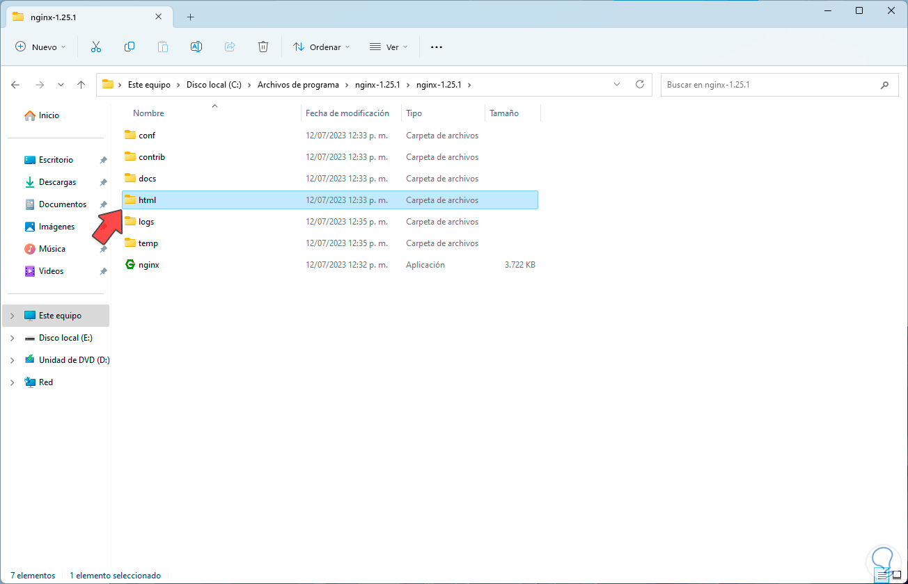 Para realizar algún cambios en el archivo de Nginx, vamos a la ruta donde está instalado y ubicamos la carpeta “html”: