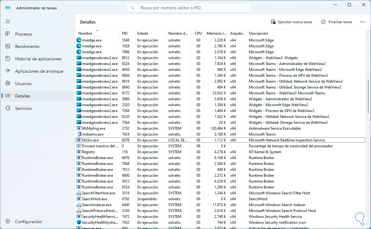 Podemos comprobar en el Administrador de tareas que nuevamente está disponible el servicio: