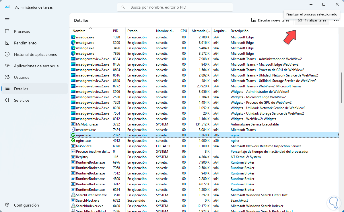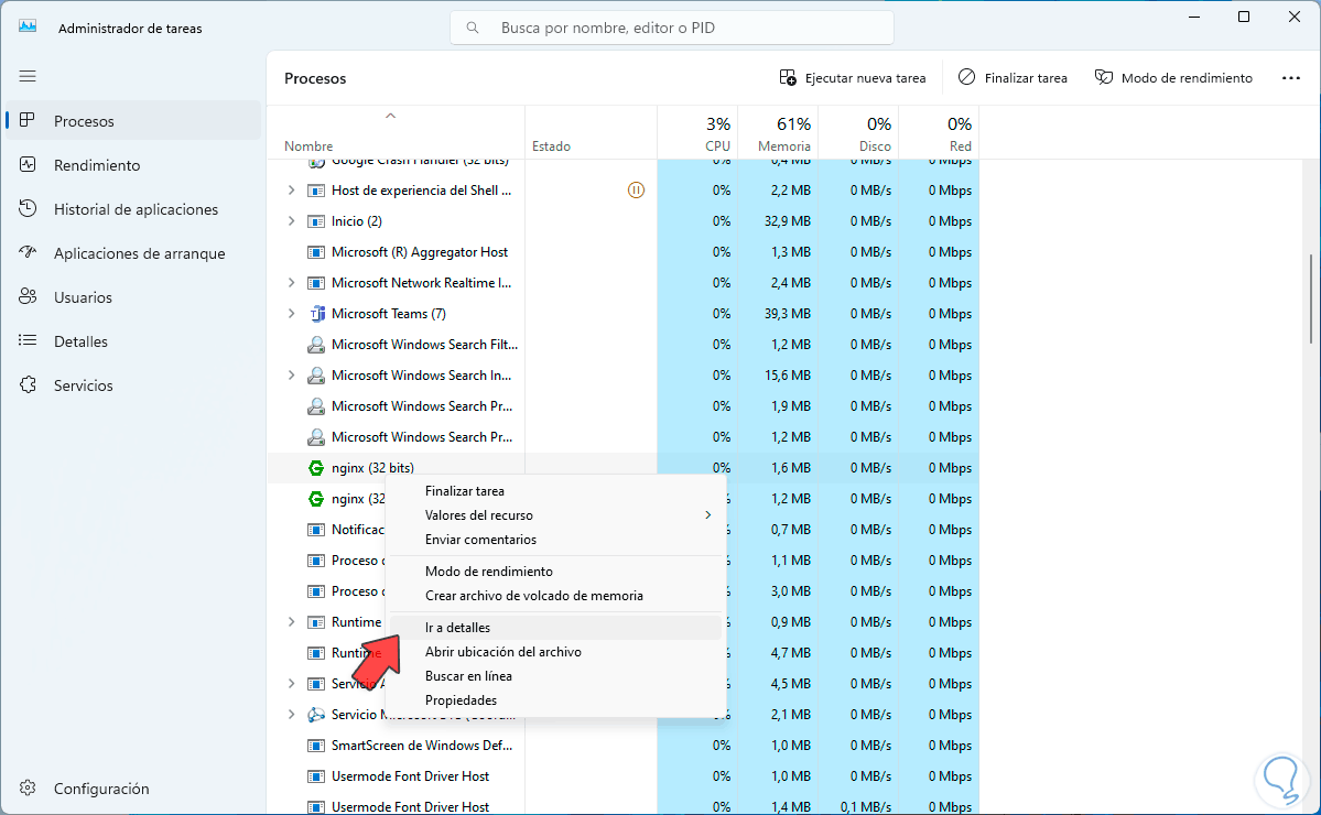 Allí vamos a ubicar el servicio llamado Nginx, damos clic derecho sobre él y seleccionamos la opción “Ir a detalles”: