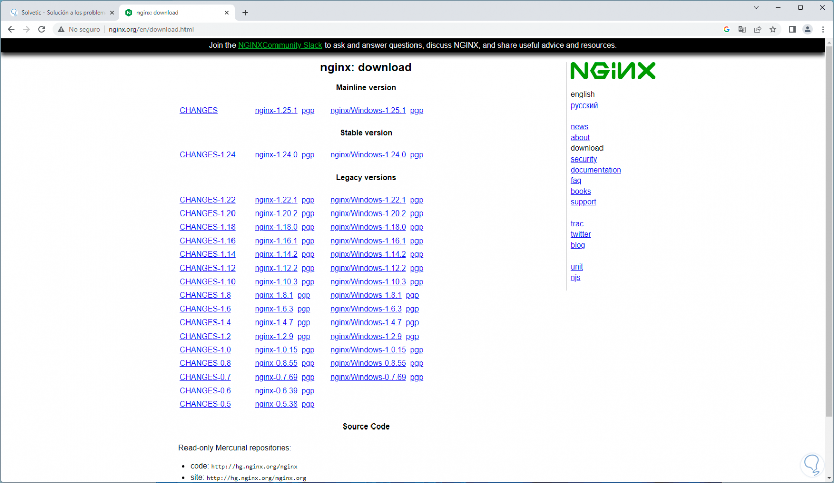 Lo primero será ir al siguiente enlace oficial para descargar la versión más reciente de la aplicación Nginx: