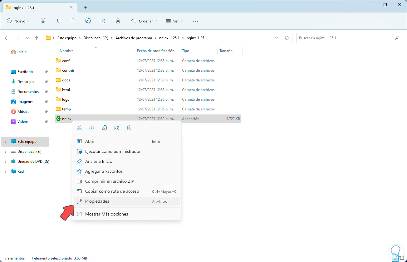Antes, vamos a dar clic derecho sobre el archivo de Nginx y seleccionamos “Propiedades”: