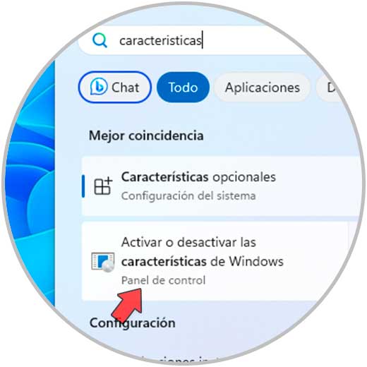 Después de esto en el buscador ingresamos la palabra “características” y damos clic en la opción “Activar o desactivar las características de Windows”: