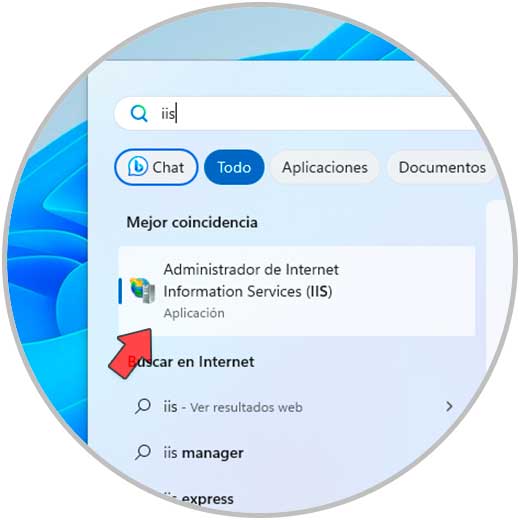 Cerramos el asistente y abrimos IIS desde el buscador de inicio: