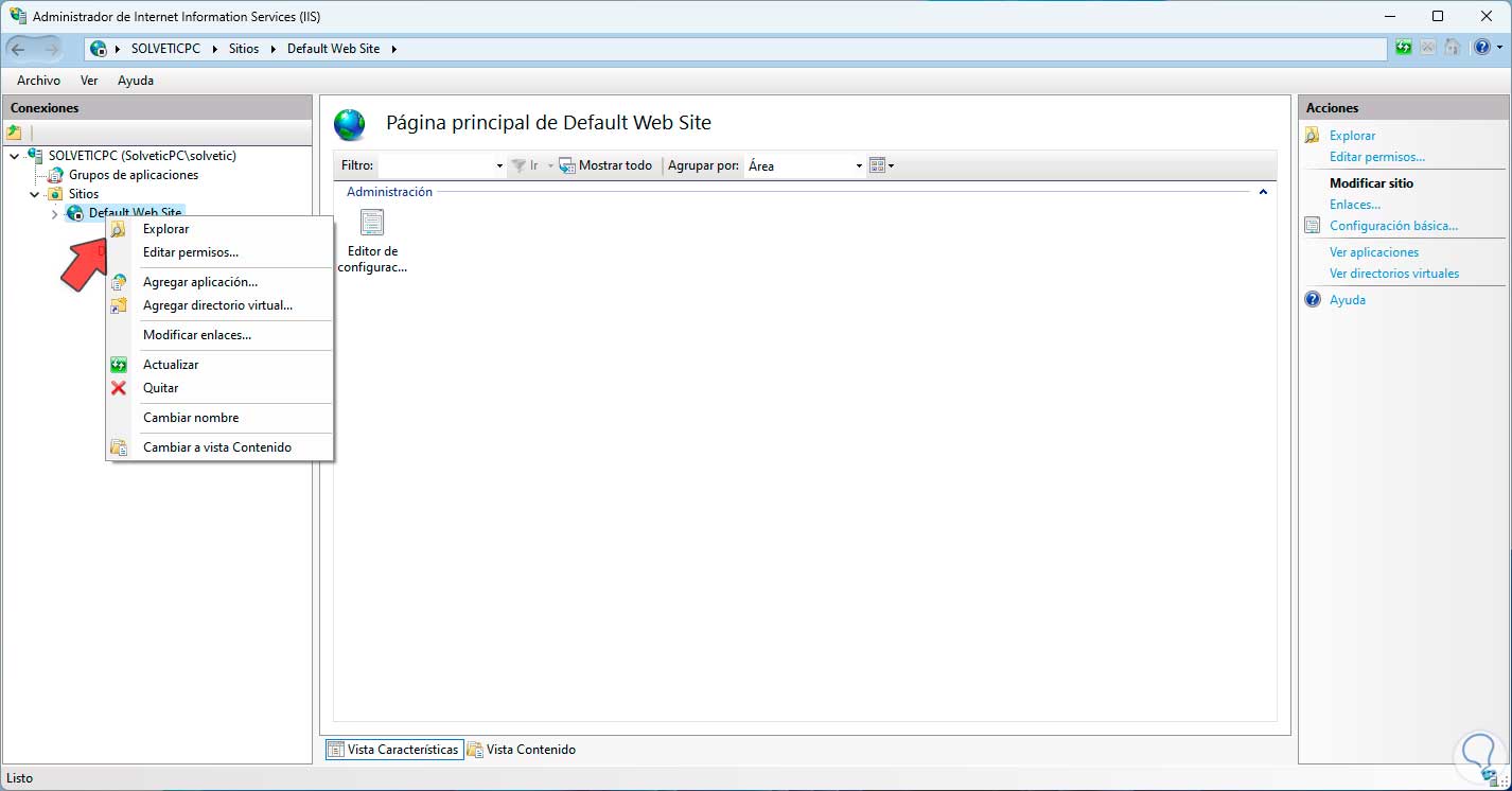 Ahora damos clic sobre el nombre de la conexión, vamos hasta la opción “Default Web Site” y allí damos clic derecho y seleccionamos “Explorar”:
