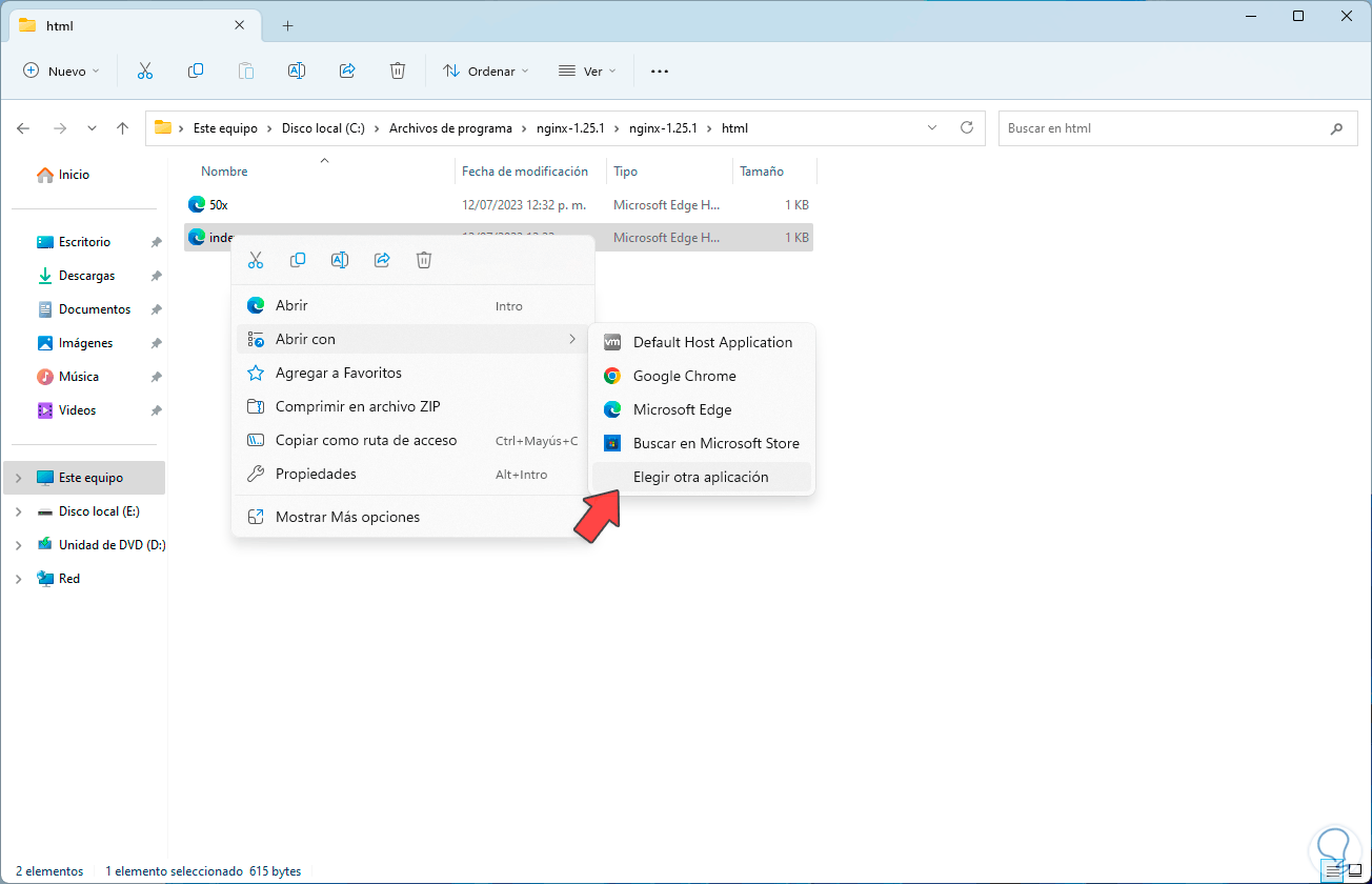 Abrimos la carpeta, damos clic derecho sobre el archivo “index” y seleccionamos “Abrir con – Elegir otra aplicación”: