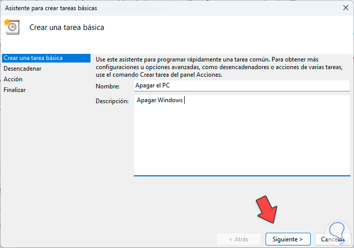 En el asistente asignaremos un nombre a la tarea y si se requiere la descripción: