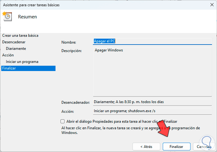 Damos clic en Siguiente para ver un resumen de la tarea a crear damos clic en “Finalizar”: