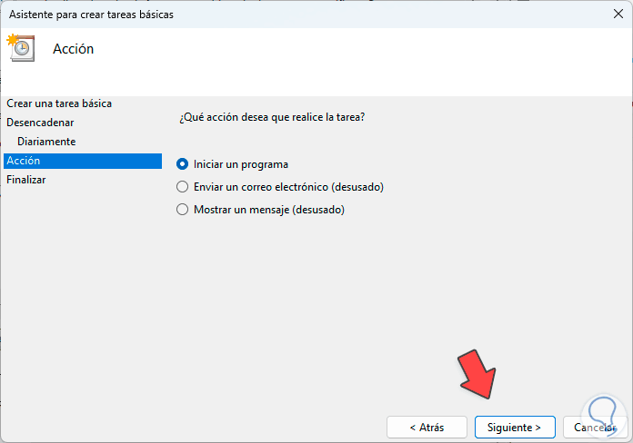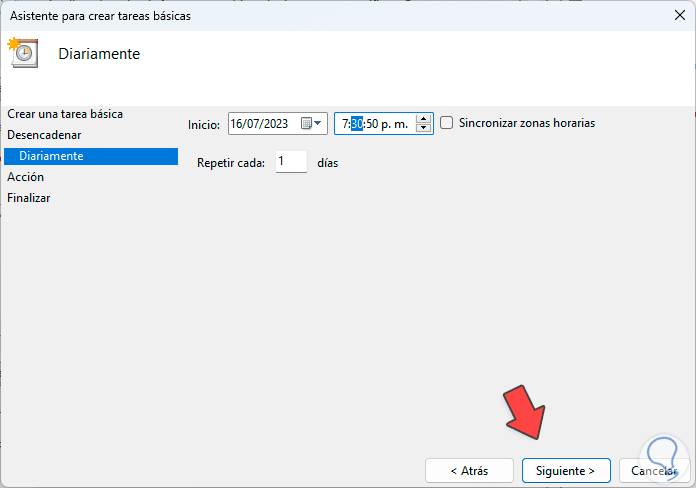 Damos clic en “Siguiente” y vamos a establecer cuándo se ha de ejecutar la tarea y cada cuanto se repite, estop abarca día y hora: