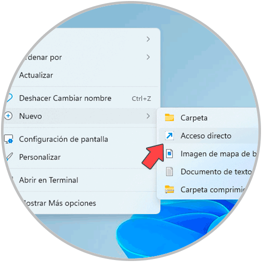 Finalmente otra de las opciones con las que contamos para programar el apagado del sistema es crear un acceso directo, para este método vamos a dar clic derecho sobre el escritorio y allí seleccionamos la opción “Nuevo - Acceso directo”: