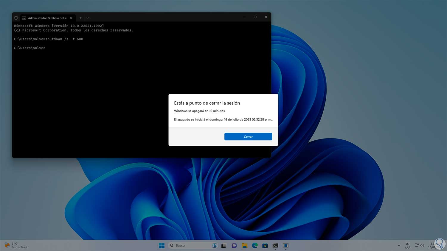 Podemos ver una notificación indicando el tiempo restante para el apagado del sistema.
