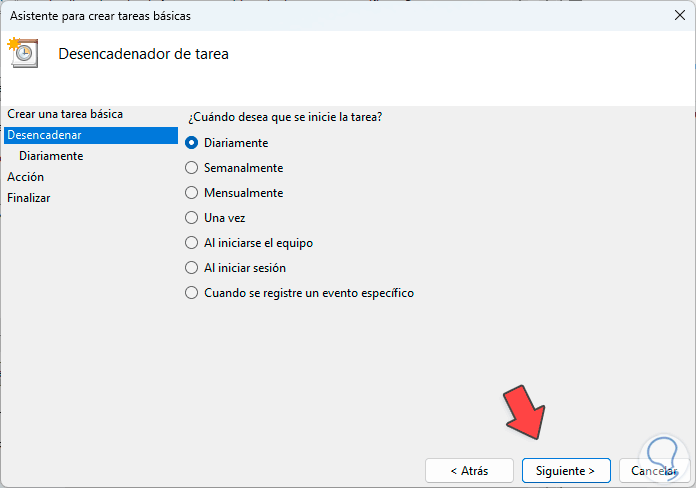 Damos clic en “Siguiente” y en la sección “Desencadenar” vamos a definir esta tarea con qué frecuencia se ha de realizar, las opciones van desde diario hasta con el propio inicio de sesión: