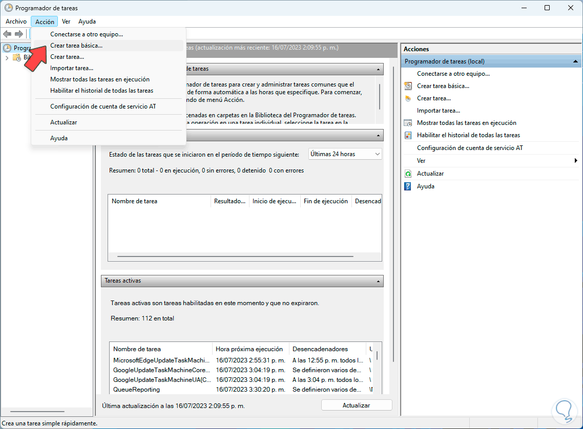 En el Programador de tareas vamos a ir al menú “Acción” y allí vamos a dar clic en la opción “Crear tarea básica”: