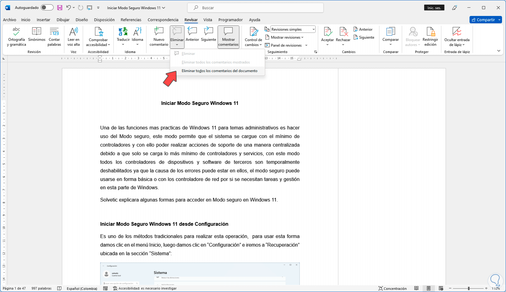 Para borrar todos los comentarios del documento, desplegamos las opciones de “Eliminar” y damos clic en “Eliminar todos los comentario del documento”: