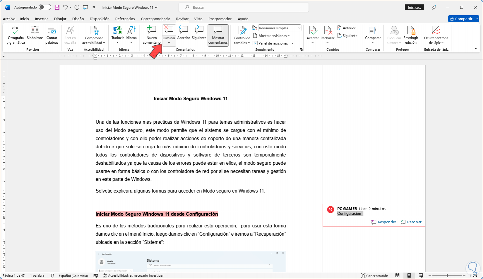 Para quitar un comentario, vamos a ir al menú “Revisar”, allí en el grupo “Comentario” damos clic en “Eliminar”: