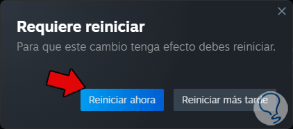 Debemos reiniciar Steam dando clic en “Reiniciar ahora”: