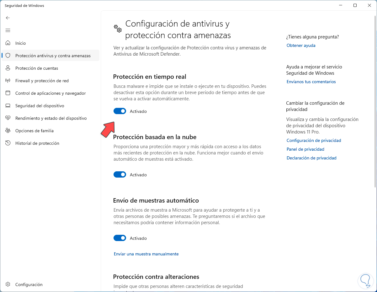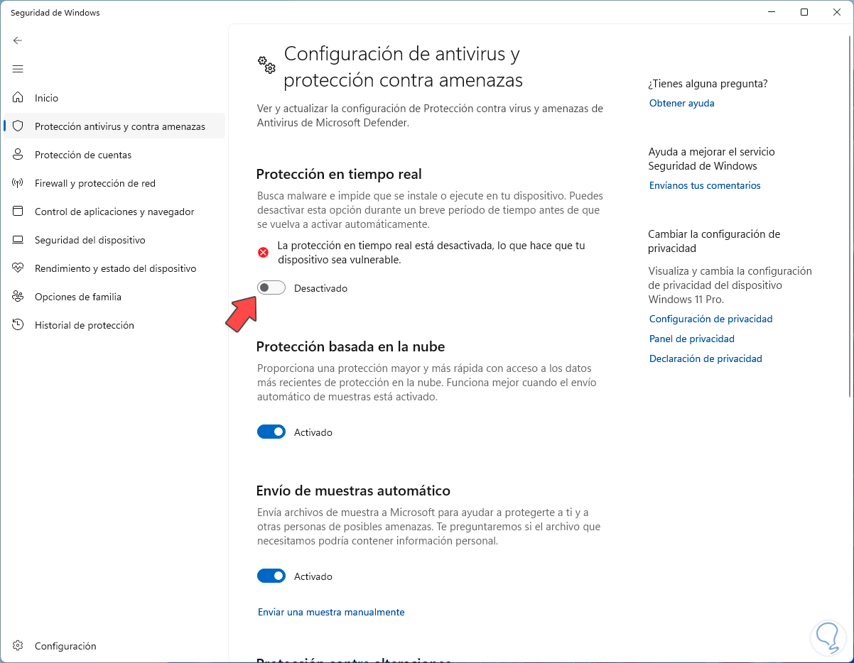 Allí vamos a desactivar el interruptor “Protección en tiempo real”: