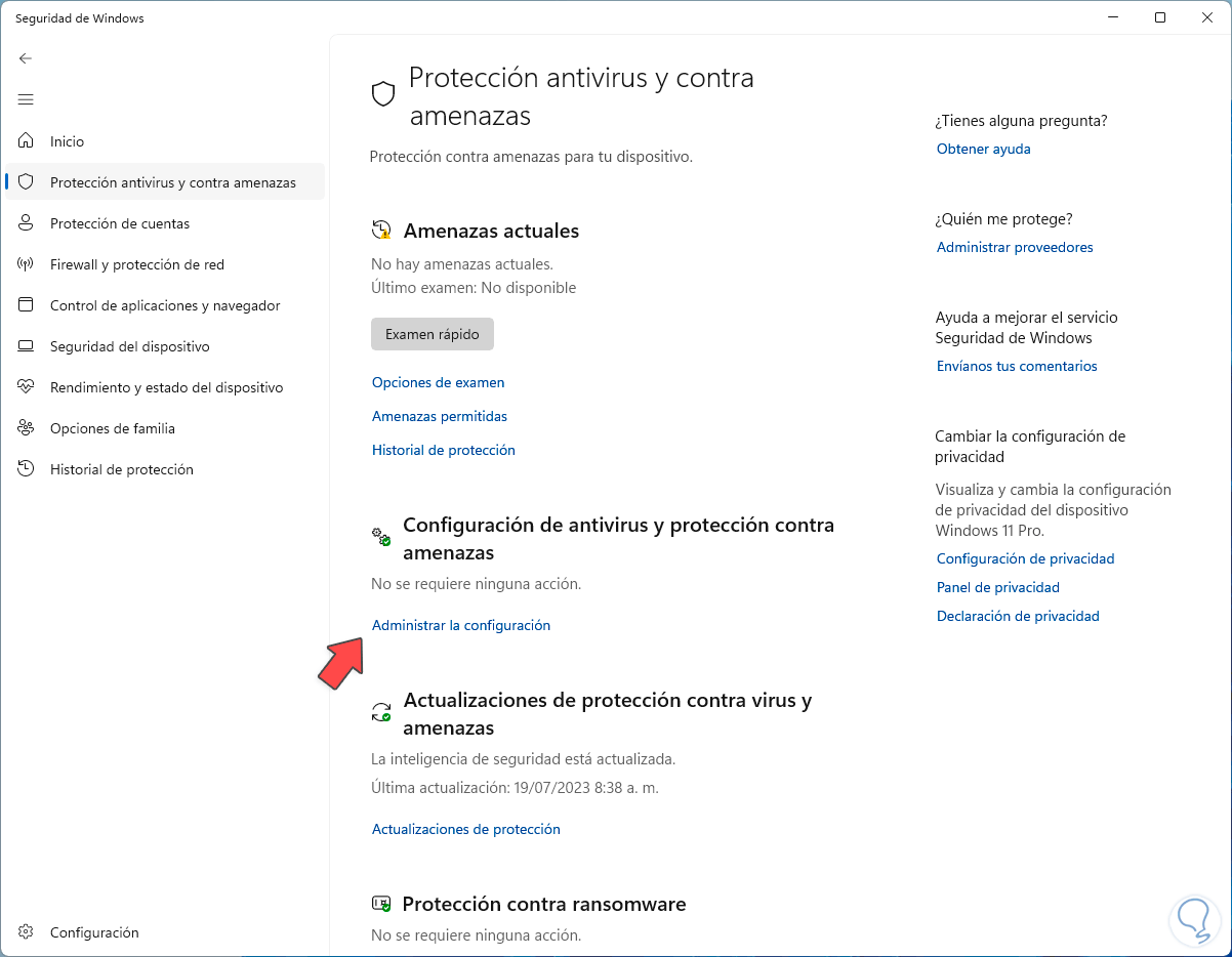 Ahora vamos a la sección “Protección antivirus y contra amenazas” y allí damos clic en “Administrar la configuración”:
