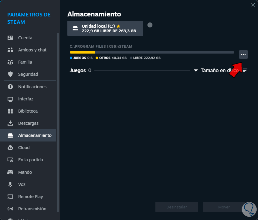 En la ventana emergente vamos a la sección “Almacenamiento”: