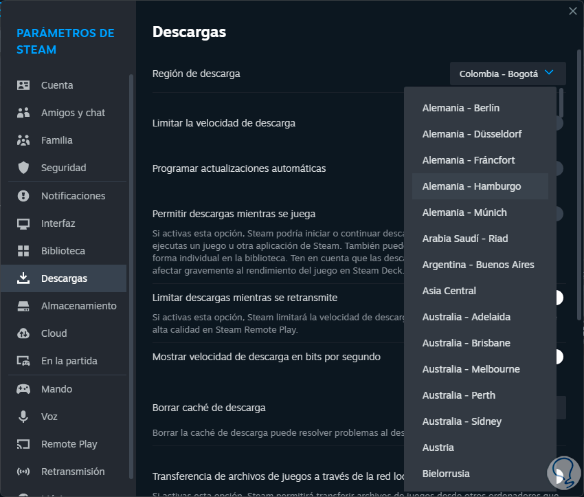 Allí vamos a elegir alguna otra región en la sección “Región de descarga”: